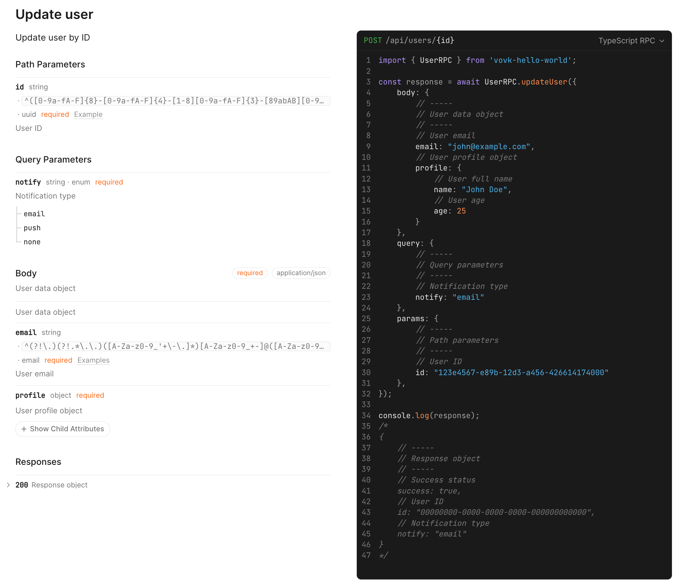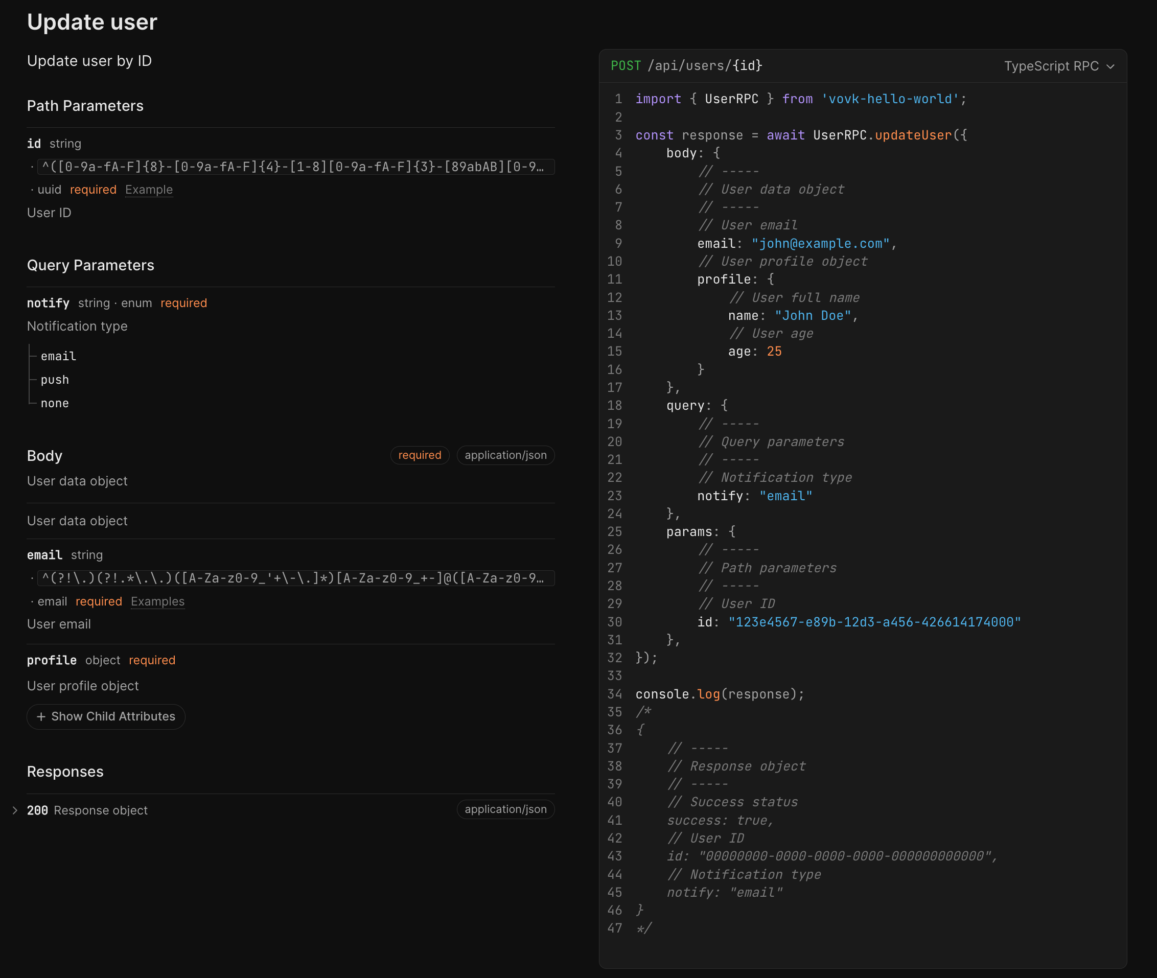 }On the client side, you can use any OpenAPI documentation generator. Scalar is a recommended choice as Vovk.ts generates code snippets for the generated RPC modules.